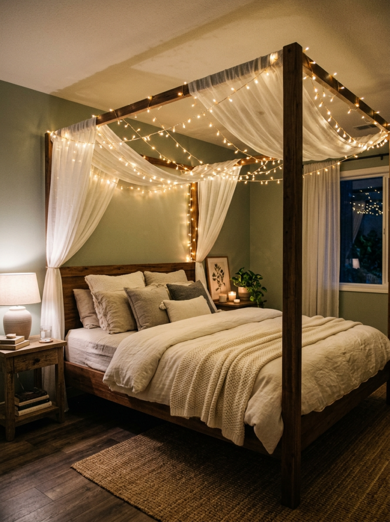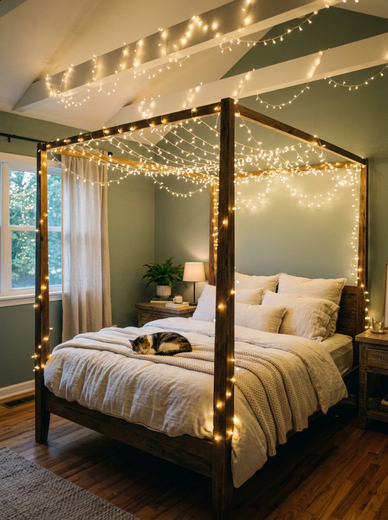 For a more structured look, attach sheer fabric panels to the ceiling and intersperse the fairy lights within or behind them. The fabric diffuses the light, creating a soft, ambient glow that feels incredibly inviting.