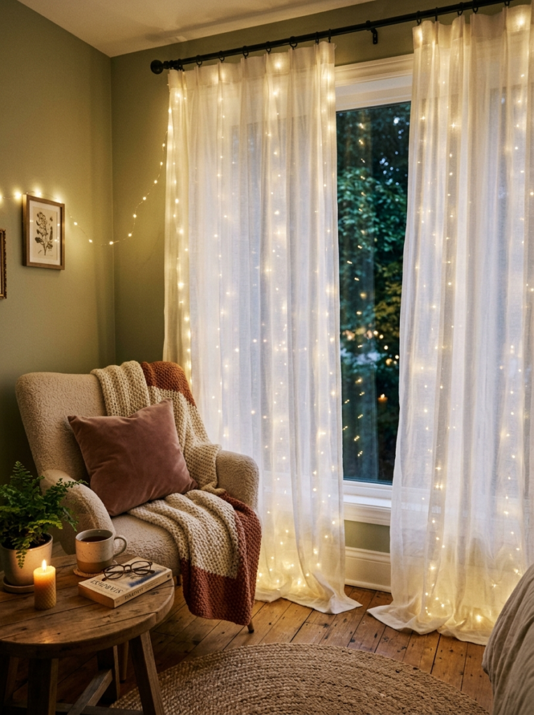 Pairing fairy lights with soft furnishings creates an instant sense of warmth and comfort. Drape strands artfully over sheer curtains, allowing the tiny lights to peek through and diffuse the light beautifully. This creates a dreamy, ethereal effect, especially in bedrooms or reading nooks.