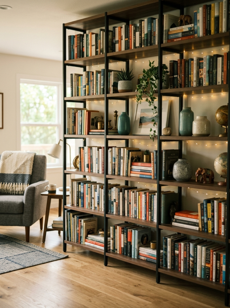 Bring attention to your favorite pieces of art or curated shelf displays by integrating fairy lights. String a delicate strand along the top or back edge of a bookshelf, allowing the lights to cast a gentle glow on your books and decorative items.